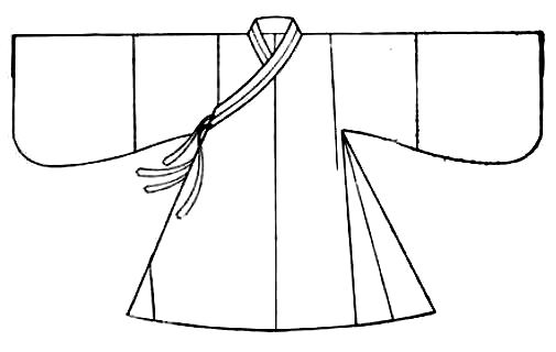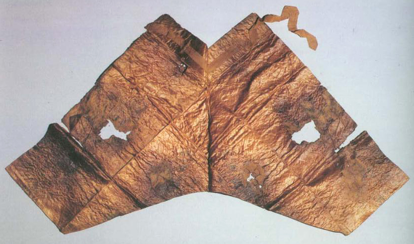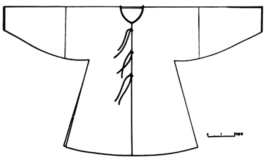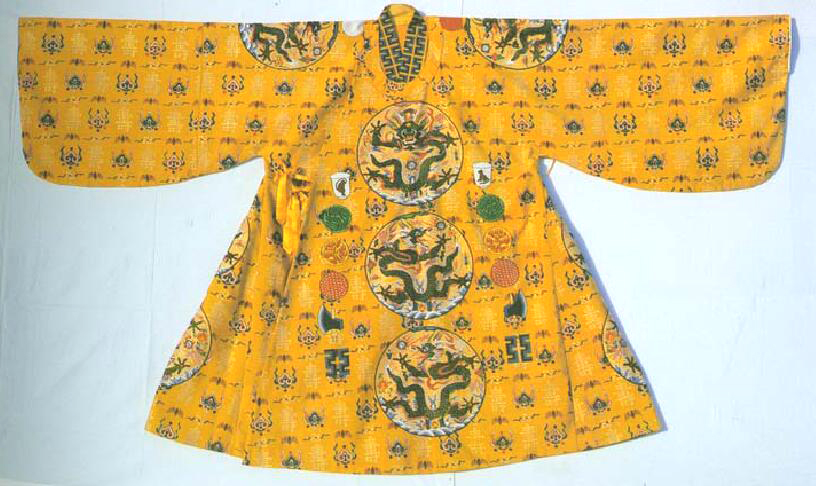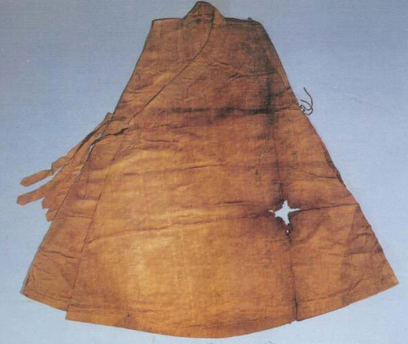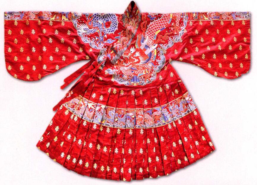 萬歷帝棺內(nèi)出土一件襯褶袍,面為織金妝花緞,里為羅。交領(lǐng),上衣與下裳相連,右腋下有絹帶一對。