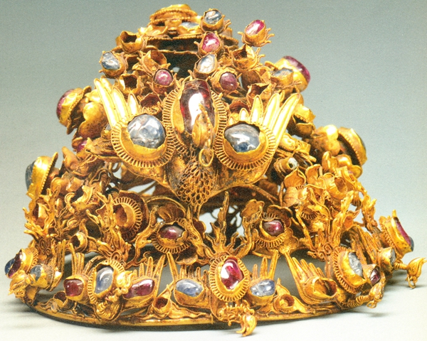 金鑲寶鈿花鸞鳳冠,高6.9厘米、底徑9.9厘米。鳳冠用粗金絲做成一個(gè)上小下大的攢尖式圓框,中心處為一只金累絲鑲寶石的大鳳,下面貼口處一溜五只金鑲寶小鳳在前,后面則為一溜金鑲寶花鈿,又以金鈿花自第二行起依次向上節(jié)節(jié)收束,最上端則以一簇寶鈿花結(jié)成一朵關(guān)頂。據(jù)墓主人的身份可知,這件鳳冠的等級(jí)應(yīng)屬于親王妃級(jí)別。