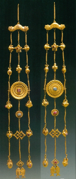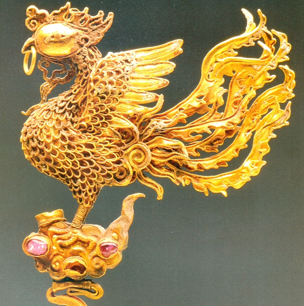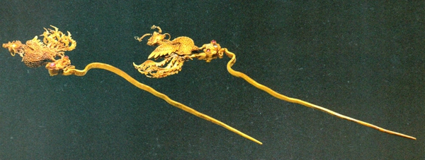 與鳳冠同出了一對(duì)金鳳簪,長(zhǎng)27.5厘米,鳳口銜環(huán),用以懸掛挑牌,足下祥云上鑲嵌三顆寶石,與鳳冠一樣,同屬于禮儀用物。