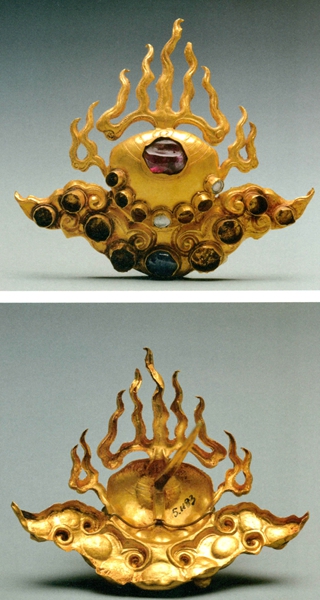 金鑲寶摩尼挑心長(zhǎng)8厘米,簪首為一朵祥云上托光芒四射的摩尼寶珠,寶珠中間鑲嵌一顆紅寶石,祥云上同樣鑲嵌寶石,基本脫落。