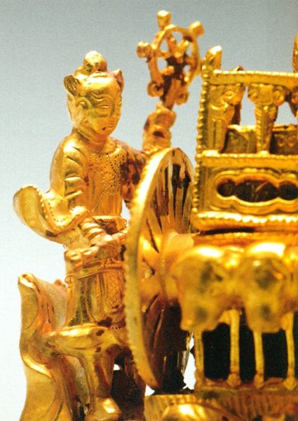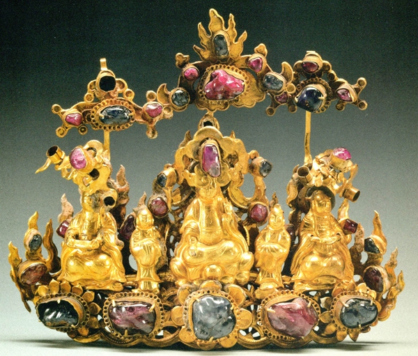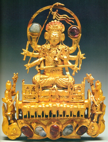都昌王朱載塎墓,位于湖北蘄春縣蘄州鎮(zhèn)雨湖村。2009年進行了搶救了發(fā)掘,墓主人為都昌王朱載塎及妃合葬之墓。女性棺墓的出土物中多為金銀首飾,除藩王墓中常見的金鳳簪等題材之外,其中宗教題材的首飾最為引人注目。金鑲寶石摩利支天挑心,高11.7厘米,寬8.8厘米。簪首圖案為密教中摩利支天像,三面八臂。頭戴佛像冠,耳珰垂肩,頸飾瓔珞。八手分別持象征日、月的紅藍寶石、弓、金剛鈴、金剛橛、寶劍、箭、矛等物,背負金剛?cè)?,雙腿盤坐于雙層寶蓮座上。乘坐九豬駕馭的方形車輿,車下有五瓣蓮座相托,紅藍寶石間隔鑲嵌于蓮瓣上。兩車輪外側(cè)各有一護法,一手持金剛輪,一手持寶劍,足踏祥云。簪身扁平,安于車輿背面,以方槽固定。摩利支,梵文MARICI,意為“光明”“陽炎”,是古代婆羅門教所崇拜的光明女神瓦拉希(VARAHI),印度那爛陀寺猶存摩利支天像。