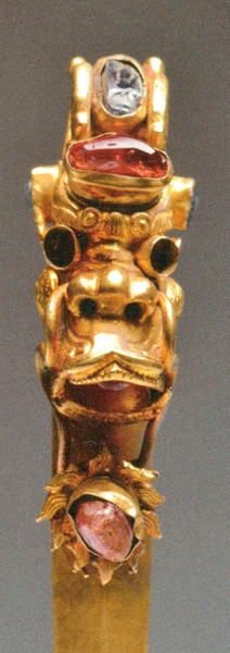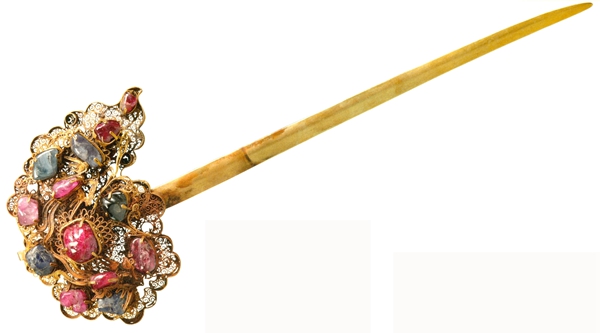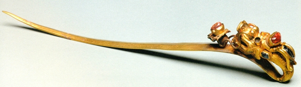 除了宗教題材的金銀首飾之外,還出土了一些其他形制獨特的簪子,如金鑲寶龍首簪,長21厘米,簪首寬1.5厘米。簪首為龍戲珠的造型。龍張口,舌頭上嵌紅寶石。雙眼原也應有嵌寶石,惜現(xiàn)已脫落。龍額頂、龍角間和龍角兩側(cè)都鑲有寶石。龍身隨形而成簪腳,簪腳扁平。另一件金鑲寶雙鳳穿花掩鬂長20.5厘米。簪首用累絲工藝做出云朵形金花托,中間為一朵重瓣菊花,菊花兩邊各一只鳳鳥,鳳身上嵌有紅寶石。鳳鳥周圍花團錦簇,簪首背面有金焊槽,內(nèi)插扁平簪腳。