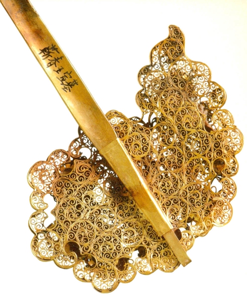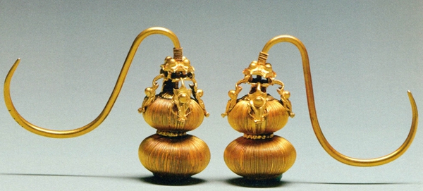 除以上金銀首飾之外,墓中還出土了一對金摺絲葫蘆耳環(huán)。長6.2厘米、高4.7厘米,整體為葫蘆造型,頂部披四葉,底部托金葉。葫蘆造型的耳環(huán)是明代耳飾中比較流行的樣式。