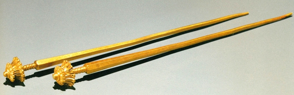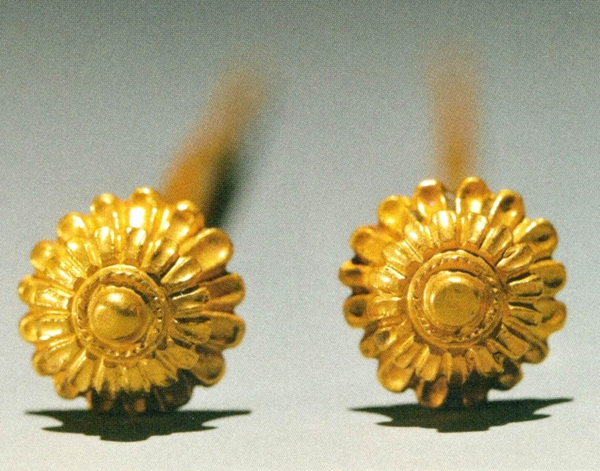 墓中隨葬了不少花頭簪和挖耳勺簪,其中一對金菊花簪,簪首為重瓣菊花,菊瓣下覆如小傘,簪首與簪腳間做出累珠式細頸連接。簪子僅長12.5厘米,簪首樣式簡單卻精致。