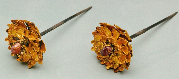 金鑲寶牡丹花頭銀腳簪(一對(duì)),長(zhǎng)僅10.3厘米,簪首用金片打造出大小不等的一圈花瓣,層層疊加,花朵極富立體感。中間的花蕊鑲嵌紅寶石。