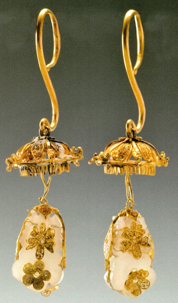金累絲鑲玉蝶趕梅耳墜(一對(duì)),耳墜上部為一金五爪提系,五爪之端為五個(gè)云鉤。下焊接一頂金累絲花葉傘蓋,其下緣用金絲條做出披垂的瀝水。傘蓋下綴一金累絲鑲玉的裝飾物,將白玉制成蝶趕花的薄玉片,嵌在兩枚金累絲的花蝶之間。這對(duì)耳墜長(zhǎng)僅7厘米,卻制作精巧,玲瓏可愛(ài),殊為難得。