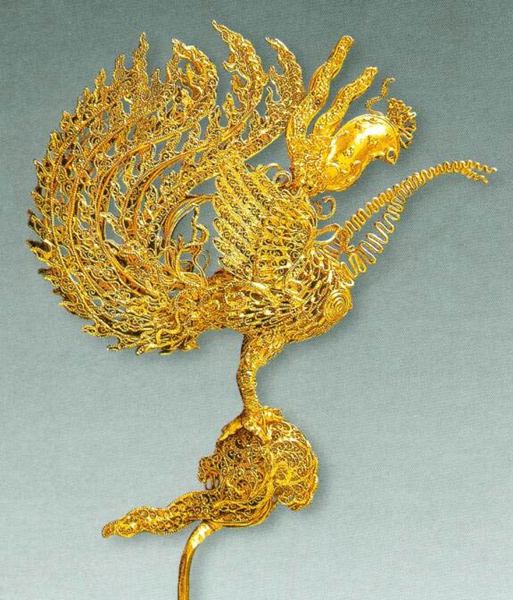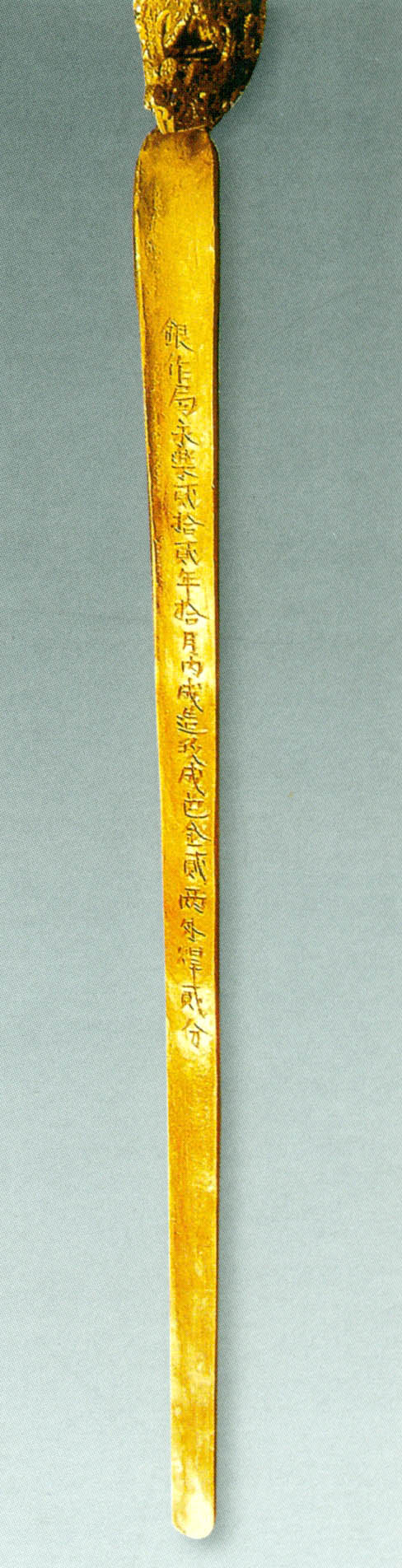 金鳳簪一對,通長13.5厘米。簪身內(nèi)邊鏨刻“銀作局永樂貳拾貳年拾月內(nèi)成造玖成色金貳兩外焊貳分”24字楷書款,這對金鳳簪于朱祐檳長子朱厚燁墓中萬氏棺內(nèi)出土的金鳳簪一樣,均有銀作局的字樣,可能是皇宮內(nèi)作為親王納妃彩禮之用。
