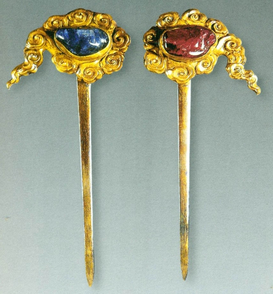 鎏金掩鬂一對,長7厘米。簪首呈祥云狀,簪首中部鑲嵌紅、藍(lán)寶石一粒。