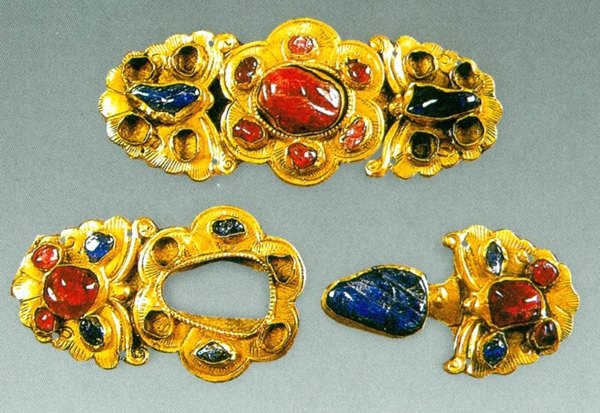 雙蝶對梅鑲寶石鎏金銀扣,2副,長8厘米、寬3.5厘米。一粒大寶石扣為花蕊,梅花瓣成扣襻,扣襻腳兩邊分別飾蝴蝶紋,兩兩相扣后,成雙蝶對梅狀?;ㄈ铩⒒ò旰偷?、蝶翅分別鑲嵌大小紅、藍(lán)寶石,蝴蝶翅膀兩邊各有四個(gè)針眼。雖是用作系襻的扣子,但仍極盡奢華。其他如金鉤、鎏金銀花、霞帔金墜子、鑲寶石鎏金釧等首飾都精美富麗。不再一一贅述。