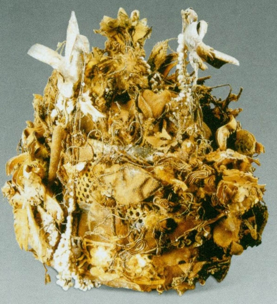 益宣王朱翊鈏墓位于江西省南城縣,為益宣王朱翊鈏與元妃李氏、繼妃孫氏的三人合葬墓。出土了金、銀、銅、瓷器和冠服等飾品共計(jì)450余件。元妃李氏棺槨中出土150件,首飾中最重要的一件是鳳冠,又稱為九翚冠。上裝飾翚鳥9只,為銀絲纏繞,口銜珠滴。冠體用銅絲編繞呈圓錐框,表面敷一層黑羅紗,前后各豎一扇博鬢。框下接金口圈,里用錦擰裝裱。冠之兩側(cè)安有金鳳釵一對(duì), 鳳鳥頭俱朝外,嘴銜長(zhǎng)串珍珠,串中再綴珠花。鳳系金葉錘壓而成, 在頸、胸和翅部鏨鱗形花紋以代短羽絨毛。其形制和重量與益莊王妃王氏棺內(nèi)所出的金鳳釵完全相同, 但時(shí)間要比王氏的早十年,鳳釵上陰刻銘文“ 銀作局嘉靖二十六年八月內(nèi)造金七錢五分”。冠形制作精細(xì)美觀,金光閃爍,珠羽生輝。冠圈口徑16.5、通高23.5厘米。