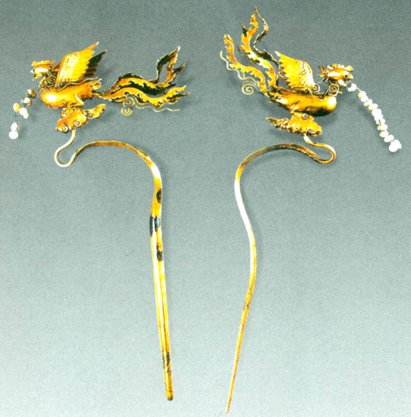 云頭鳳紋鑲寶石金掩鬂一對(duì)。寬7.5厘米,長(zhǎng)6厘米。簪首為祥云狀,邊緣一周鑲嵌11顆寶石,中部為一只捶壓成型的飛鳳,兩只鳳的形態(tài)形同,細(xì)頸,五根尾羽長(zhǎng)而飄逸。