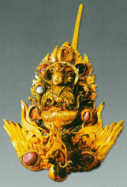 觀音乘鳳金簪一件。重80 克,長(zhǎng)10厘米。簪腳長(zhǎng)10厘米。金鳳呈昂首展翅高飛狀,尾部鑲嵌觀音金佛像一尊,佛高4 厘米,跏跌于蓮花座上,頭戴冠,身披云肩,手捧仙草,腦后有背光一輪,在佛像背面利用鳳尾的周邊做成火焰七束,各鑲嵌寶石一顆。