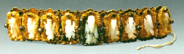 嵌玉鑲寶石金鈿,花鈿整體呈弧形,上用金片捶壓出9個(gè)圭狀的神龕,每個(gè)龕內(nèi)鑲嵌一尊白玉神像,從左至右分別是:韓湘子、曹國(guó)舅、藍(lán)采和、漢鐘離,居中略大的是南極壽星、鐵拐李、呂洞賓、張果老、何仙姑。神龕四周裝飾海濤、壽山、云花紋,花鈿上鑲嵌有寶石,現(xiàn)殘存紅寶石18顆。
