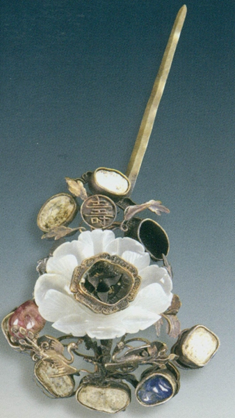 金玉鑲寶石簪一件,簪首頂部為二只相向而立的鳳凰,口銜瑞草。周圍鑲嵌紅藍(lán)寶石,簪首中部鑲嵌一朵玉雕牡丹花,花蕊中間的寶石已經(jīng)缺失。尾部以瑞草圍繞一鏨刻“壽”字,簪首周圍有8各金花,僅殘存2顆。通長19.2厘米,簪首長8.4厘米。