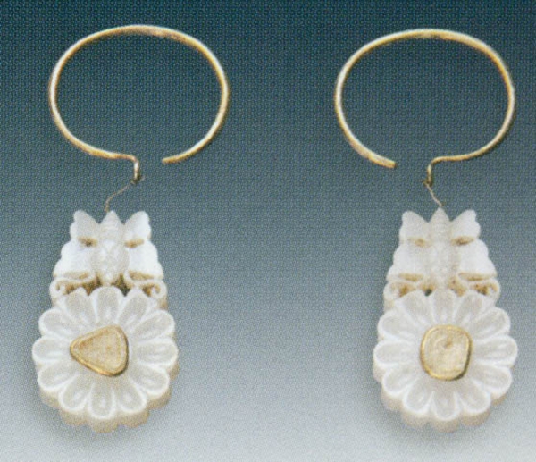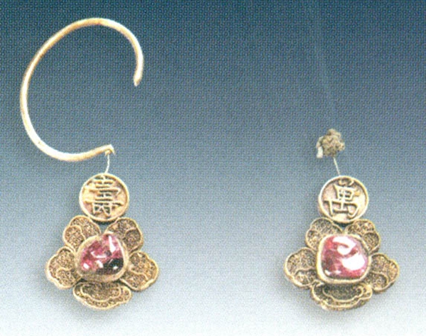 金耳墜一對,五瓣花朵形,花瓣是在輪廓內(nèi)填絲而成,兩側(cè)中央各鑲嵌一顆紅寶石作花蕊?;ǘ漤敳亢附訄A形金片,金片一面鏨刻“萬”字,一面鏨刻“壽”字。耳墜以金絲連于金鉤上,其中一個金鉤殘缺。通長6.1厘米。