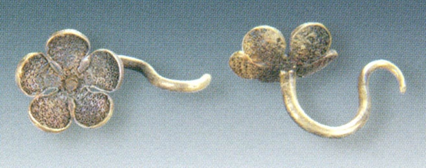 金耳釘一對,樣式簡單,由一五瓣花朵和金鉤組成,僅長2.6厘米。