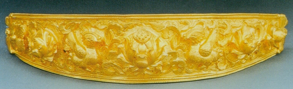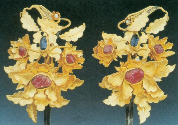 花鈿共出土兩件,一件為鴛鴦戲蓮紋花鈿,通長(zhǎng)11.8厘米。兩端為蝴蝶,中間為鴛鴦、蓮花并配以草葉,邊緣飾以聯(lián)珠紋。另外一件為鑲寶石花鈿,簪身長(zhǎng)8.9厘米。呈弧形環(huán)帶狀。焊接菊花、牡丹花,嵌紅藍(lán)相間寶石9顆花蕊,配以小金葉。