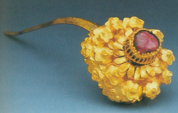 鑲寶石金頂簪一件,通長(zhǎng)15.6厘米。簪首為用金片打制的花朵,花蕊處鑲嵌一顆紅寶石。