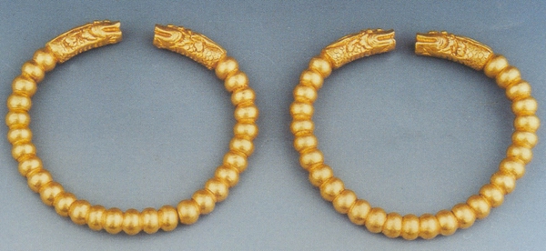 金手鐲一副兩件,鐲身聯(lián)珠式,連接處為兩龍首相對(duì)。