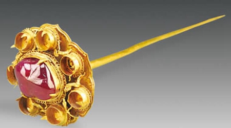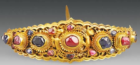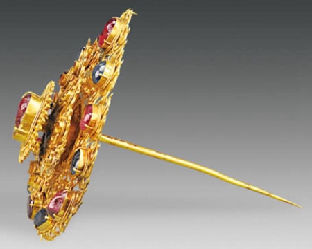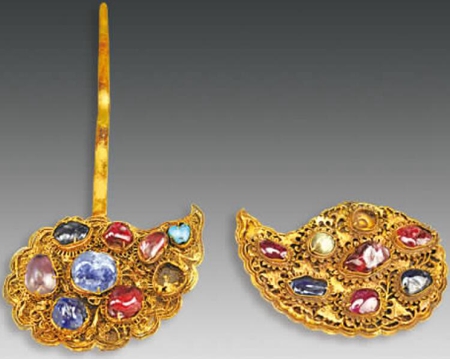 鑲寶石火焰紋金頂簪,簪首整體呈桃形火焰狀,分3層,中間一層為雙層菊瓣紋,花蕊處鑲嵌一顆大紅寶石,外兩層均為火焰紋,一周均有爪托,內(nèi)鑲嵌有紅藍(lán)寶石,只是第二層的寶石均已不存。簪腳長(zhǎng)12.3厘米。