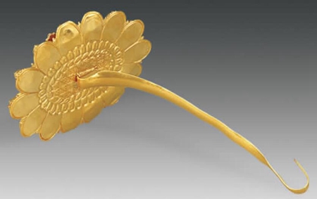 鑲寶石金挑心1件,簪首為橢圓形菊花狀,分4層,中間為圓形雙層菊瓣紋,花蕊處鑲嵌一顆紅寶石,其外三層每個(gè)花瓣上均鑲嵌寶石。簪腳長(zhǎng)16.5厘米。