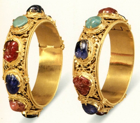 鑲寶石金鐲一對(duì),形制相同,由兩個(gè)半圓形金片扣合而成,其中一端為活頁(yè)式連接,另一端用一根插銷連接,活頁(yè)和插銷頭均做成花瓣形,鐲子內(nèi)部光潔,外壁上下飾連珠紋,中間以折紙花卉紋為地紋,上用金片錘揲出花朵,花蕊中部均鑲嵌各色寶石。直徑7厘米。