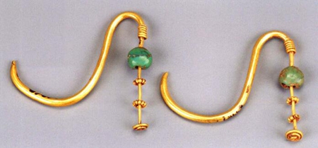 鑲綠松石金耳墜1對(duì),上為“S”形金鉤,耳墜部分比環(huán)鉤部分細(xì), 相接部分以金絲盤繞成環(huán),其下串有一顆綠松石,再下間隔2 圈金珠環(huán),至耳墜首端金絲盤繞成螺旋狀。高3.7~4厘米。