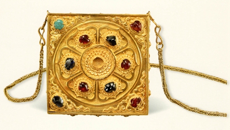 除以上首飾之外,梅氏墓還出土了一件鑲寶石金鏈香盒和一對(duì)金扣。香盒為方形,抽式蓋。蓋面上為蓮花和如意云紋,蓮花花瓣、花蕊和如意云上均鑲嵌寶石和綠松石。盒底四角飾如意云紋,中間為“福”子及梵文六字箴言。盒高1.7厘米,邊長(zhǎng)8.5厘米。