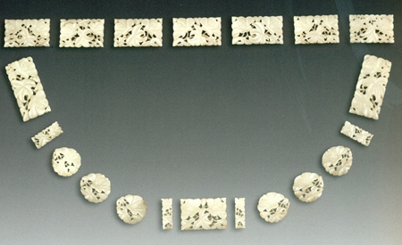白玉革帶一副,包括二十塊,分為銙和鉈尾,每塊上均鏤雕秋葵葉,花葉舒展,雕琢精致。