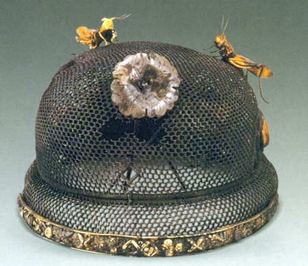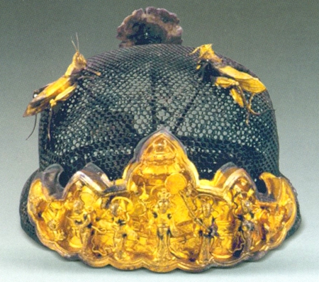銀絲鎏金發(fā)罩共出土4件,其中2件已殘。M3出土的1件保存較為完好,發(fā)罩用銀絲為框,并以銀絲編結(jié)網(wǎng)格,一側(cè)編有一牛角形鏤空裝飾,另一側(cè)編有一半圓形孔,內(nèi)粗銀絲結(jié)“壽”字,發(fā)罩前部插山峰形人物故事金分心,后部邊緣插金雜寶紋金滿冠,內(nèi)鏨刻樓閣、人物故事等。發(fā)罩上插戴各式簪子近20件,包括蚱蜢形簪1對,蝦形簪1對,銀嵌玉荷花簪1件,金山峰形人物故事簪1件,金蝶形簪1件,金嵌寶石梅花對簪2對,金蓮花對簪1對,金花片首對簪1對,金耳挖簪1對,金圓球首簪1件。這大致是明代婦女“頭面”的基本面貌。