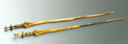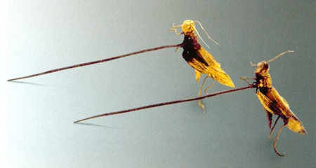 其中蚱蜢對簪一對,銀質(zhì)鎏金,簪首的蚱蜢用銀箔加工成型,兩腿收縮,兩翼合攏,呈跳躍狀,蚱蜢長3厘米,簪長7.3厘米。另有一對蝦形對簪和一件鑲寶石蝶形發(fā)簪與此有異曲同工之處。
