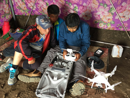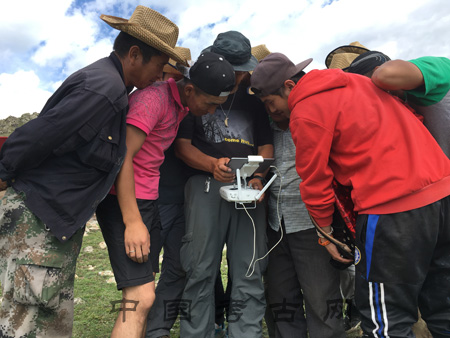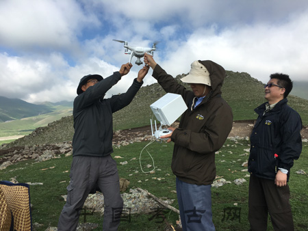 社科院考古所劉建國(guó)老師來(lái)呼斯塔遺址展示了航拍器的使用。“看,飛起來(lái)了!”隨著大家的歡呼,一架懸掛著相機(jī)的“遙控飛機(jī)”在工作人員的操縱下飛上天空,并且在遺址的上方停留,目標(biāo)遺址的全貌清晰地收錄其中。