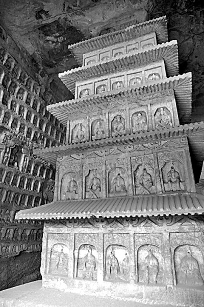 云岡第39號窟是非常經(jīng)典的一種石窟類型,能夠很好地解釋石窟寺的起源。這是一個方形的洞窟,中間矗立著一座五層方形大佛塔,稱作塔心柱,其實是非常寫實的北魏木結構佛塔的大模型,每層逐漸縮進,雕刻得非常細致,把每層的立柱、闌額、檐下的斗栱,甚至屋檐上的椽子和瓦都雕刻出來(見圖②)。
