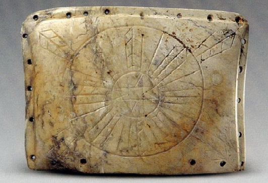 首先是很有名的一件安徽含山凌家灘出土的距今約5300年的玉版。這塊玉版藏于一件玉龜之中,內(nèi)外有四重圖像,最中心是一個指向四方的八角圖形。漢人常認為這是所謂“龜書”或“洛書”。但馮時提出,與這塊玉版圖案相似的考古材料的出土地點,都在太行山以東,北至遼河下游,向南到黃河下游、長江中下游,而太行山以西至今未見一件。并且這種圖像今天在西南少數(shù)民族如彝族、苗族、傈僳族等的風俗里還大量存在,有些圖像配以八卦,彝語把八卦稱作“八角”。因此,通過考古材料,太行山以東的上古文明可以與今天西南少數(shù)民族建立某種聯(lián)系。