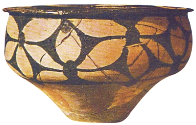 河南三門(mén)峽廟底溝遺址出土的仰韶文化中期彩陶花瓣紋盆。