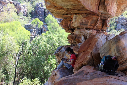 我們工作期間的大本營位于卡卡杜公園東北部的賈比魯營地,當(dāng)我達此地時,營地里已聚集了十多位分別來自澳大利亞、英國、美國、墨西哥、法國、荷蘭的巖畫學(xué)者,同時還有志愿者和卡卡杜公園的原住民管理員。此次調(diào)查我們共分5組,每組4-5人,每天分散于廣袤的阿納姆高地進行巖畫調(diào)查,手持GPS記錄儀,對巖畫點進行地毯式搜尋,平均每天的徒步時間都超過10小時。調(diào)查時正值南半球的冬季,但由于此處位于澳大利亞北端,只分干濕兩季,每天的氣候都異常干熱,上午十點到下午四點之間的平均氣溫超過35攝氏度,不過相較雨季已是野外調(diào)查的最佳時機。我們的主要工作是利用google地圖對巖畫進行記錄并繪制3D巖畫分布地圖,建立僅對巖畫學(xué)者和保護區(qū)管理人員開放的巖畫基礎(chǔ)資料平臺網(wǎng)站,在巖畫點詳細記錄每一處新發(fā)現(xiàn)的巖畫,對以往發(fā)現(xiàn)的巖畫進行復(fù)查,記錄巖畫點每一次調(diào)查的不同發(fā)現(xiàn)與變化以及保存情況。根據(jù)不同區(qū)巖畫特點制作巖畫調(diào)查表,定期回訪原住居民社區(qū)并與其交流,同時,向政府及有關(guān)部門提出針對每一個巖畫點或其他石質(zhì)文物保護的措施,這樣的工作幾乎每年都會由澳大利亞本地學(xué)者和高校師生在阿納姆高地進行,因此該地區(qū)的巖畫數(shù)量一直在增加,就我們此次調(diào)查期間就又增加了幾十處新的巖畫點。