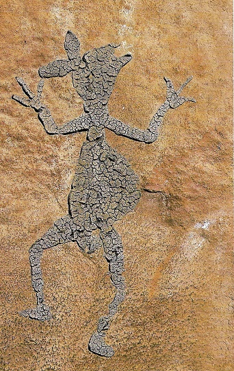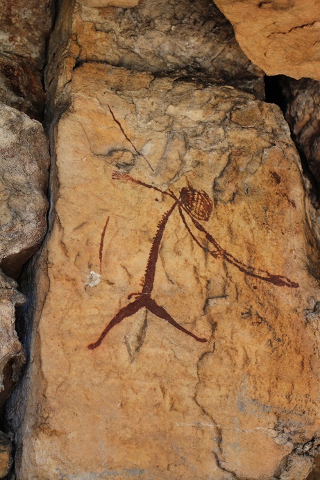 “米米”(“米米”為原住民語)風(fēng)格巖畫則是那里最古老的彩繪類型之一,其特征是圖像很小,男性在作品中出現(xiàn)得較多,但也有些畫得很好的跳舞或奔跑的女性。人物有著纖細的體態(tài)和復(fù)雜的頭飾,永遠保持運動的姿態(tài),絕大多數(shù)的人物身體總是向前或向后傾斜,叉開雙腿,邁著大步,他們張開纖長的胳膊,仿佛正在投擲長矛或其它狩獵工具。也幾乎所有的“米米”人都戴著巨大的頭飾,遮住大部分臉孔,幾乎看不清人物的臉部面貌.手腳也很少畫手指和腳趾等細節(jié)。