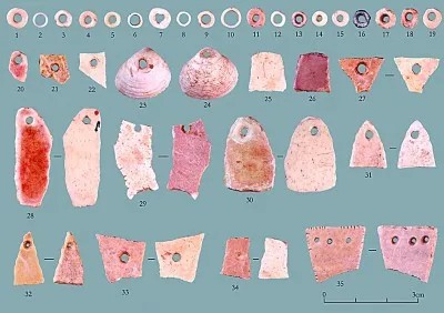 這些裝飾品類型多樣,表現(xiàn)出復(fù)雜的制作技術(shù)。類型主要為串珠,也有墜等其他類型。串珠有貝殼、螺殼、鴕鳥蛋皮、骨管等,還發(fā)現(xiàn)了不同形制、不同加工階段的半成品,系統(tǒng)展示出串珠類裝飾品的加工工藝流程。一些裝飾品呈現(xiàn)出非常復(fù)雜的工藝,如小骨管做的小串珠,精致程度不輸現(xiàn)代工藝品。