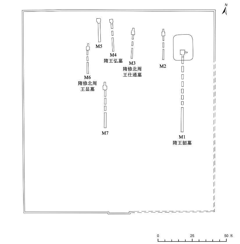 圍溝呈口大底小的溝槽狀,南圍溝中部一段向南凸出,模擬墓園入口。兆域內(nèi)分布有7座墓葬(編號2019XDHM1-M7),均為斜坡墓道多天井的土洞墓,坐北朝南,具有典型的北周-隋代墓葬形制特征。