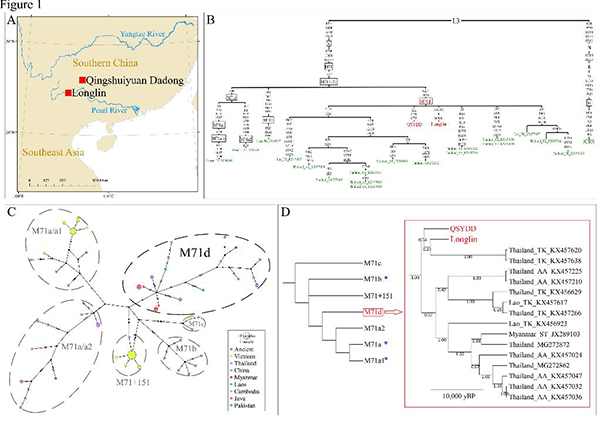 序列分析顯示隆林和大洞樣本的線粒體序列均屬于M71單倍群,除此之外,二者還共享編碼區(qū)6257A和11518A兩個突變位點。研究者進一步對兩個古個體,及有報道的來自中國南部及東南亞的4784條現(xiàn)今現(xiàn)代人和82條古線粒體全基因組數(shù)據(jù)進行了分析。結(jié)果顯示,6257A和11518A兩個突變位點,僅存在于東南亞現(xiàn)今現(xiàn)代人樣本中,在東亞現(xiàn)今現(xiàn)代人樣本中未觀察到?;诖?,研究者在M71單倍群命名的基礎上,增加了6257A和11518A兩個突變位點,命名為M71d單倍群。系統(tǒng)發(fā)育分析顯示大洞及隆林樣本屬于M71d單倍群的早期類型。貝葉斯法和Rho估計均顯示M71d單倍群起源于2,2000年左右。系統(tǒng)發(fā)育網(wǎng)絡(Network)分析也顯示隆林和大洞樣本位于M71d單倍群基部。以上結(jié)果說明,可能在一萬一千年乃至更早時期,東亞南部到東南亞存在自北向南的人群遷移,然而由于沒有同時期的東南亞樣本,還需要進一步研究來驗證這一假說。