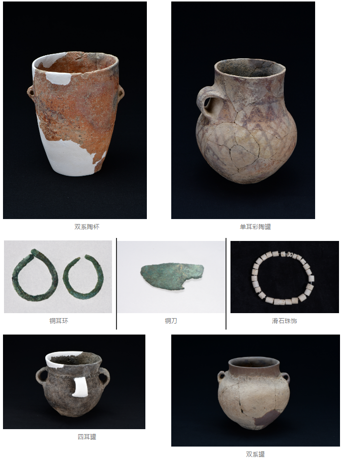 隨葬器物以滑石珠飾、銅器、陶器為主,有少量綠松石珠、金飾,不見鐵器。銅器有耳環(huán)、銅扣、銅泡、銅管、銅珠、銅錐、銅刀等,均為小件器物。陶器有素面和彩陶,以單耳器為主,有少量雙耳、四耳器,其中小平底、帶耳器為典型特征,少見圜底器。石棺外隨葬的陶器底部均鉆孔,個別陶器裝飾有附加堆紋,口沿部有小孔。彩陶紋飾以三角紋、網(wǎng)格紋為主,有少量葉脈紋。