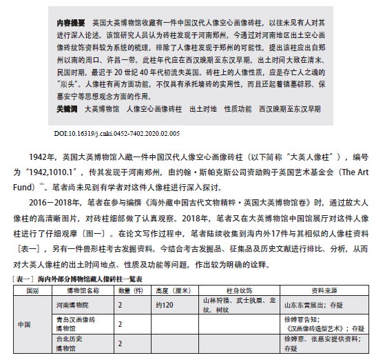 大英博物館藏漢代人像磚柱出土?xí)r間地點(diǎn)及功能探微(上)